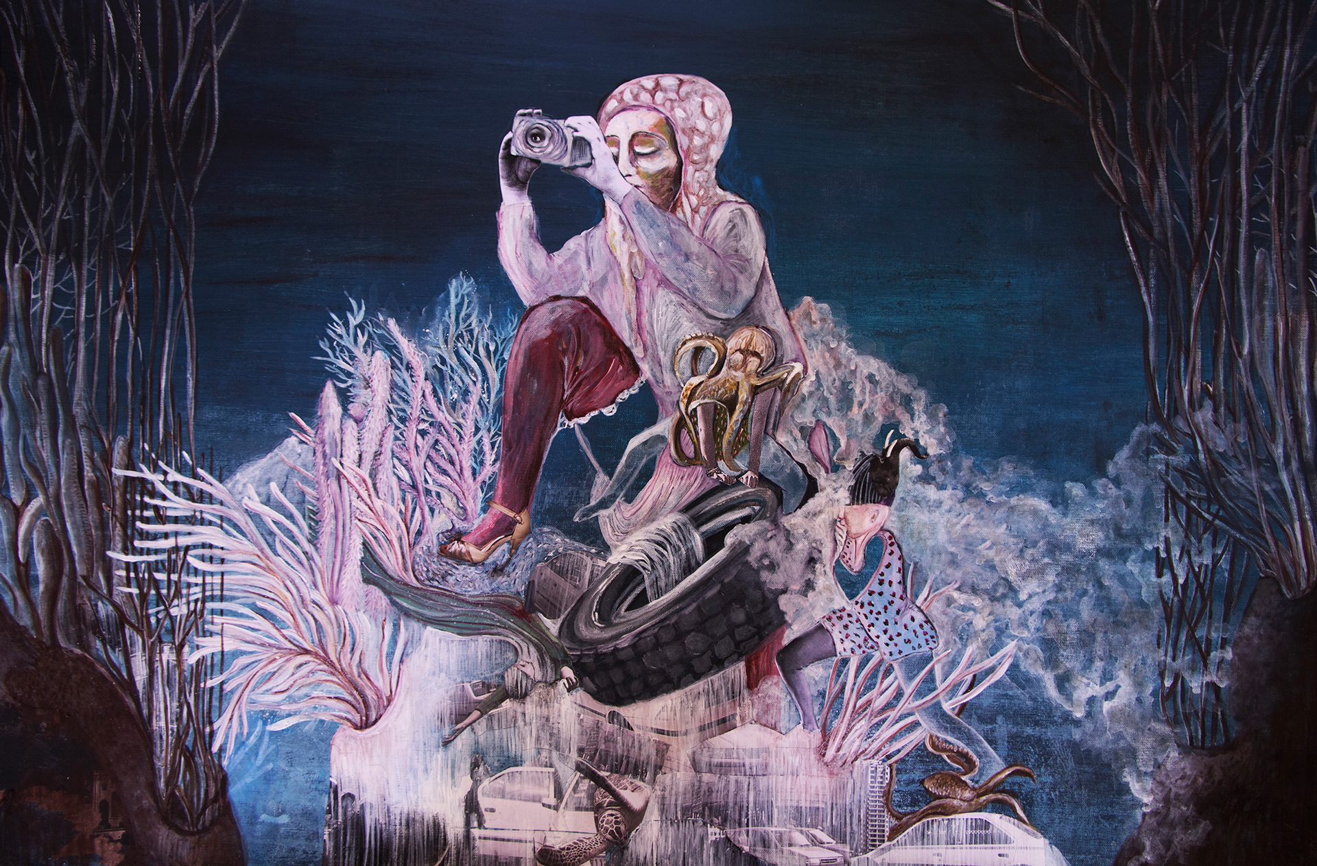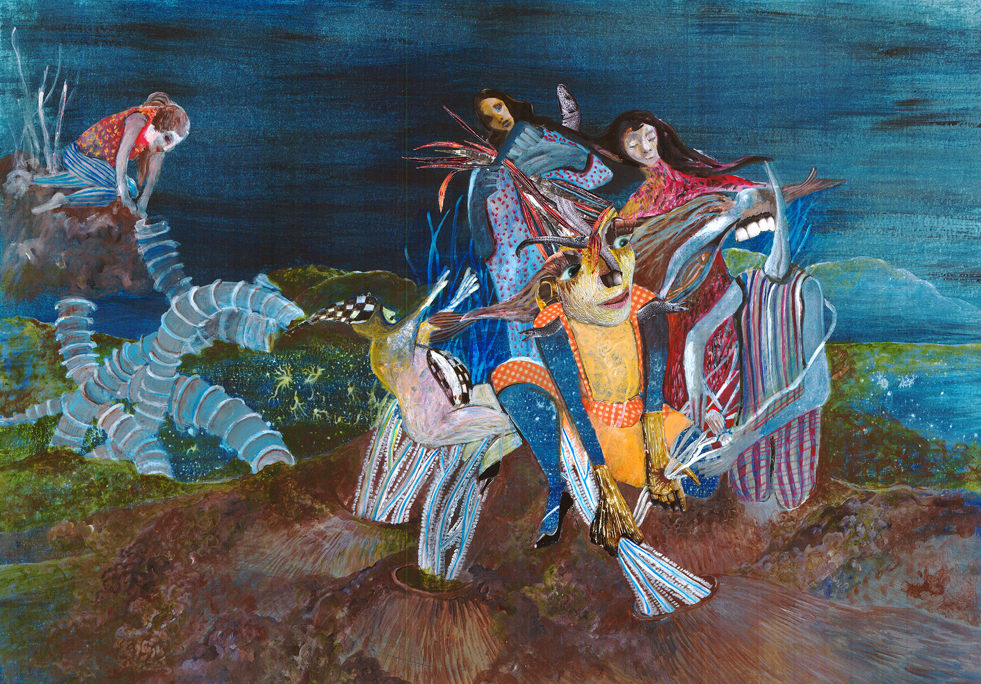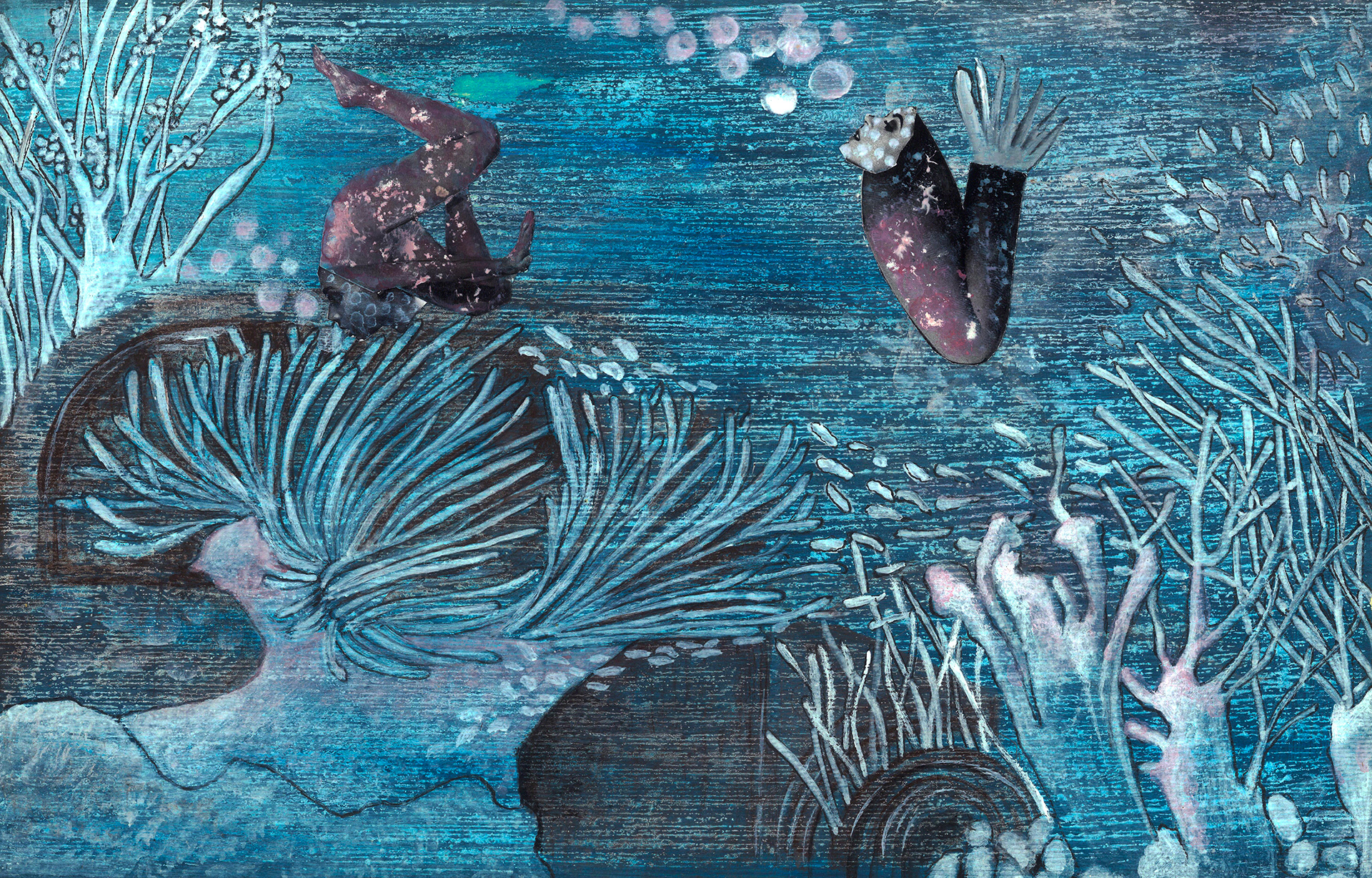Red Conversation under the sea/ Acrylic, collage, cardboard/ 2022