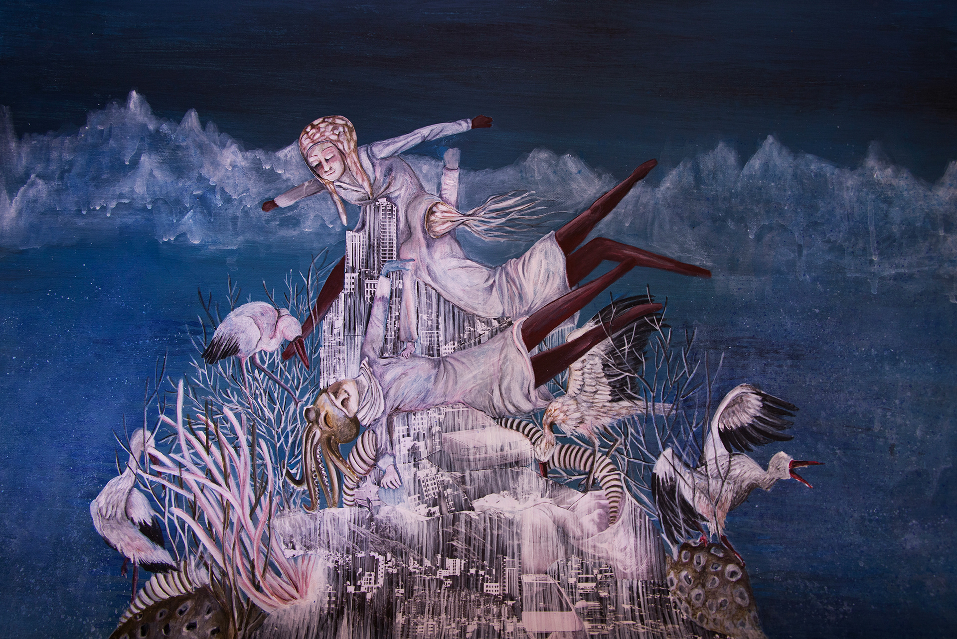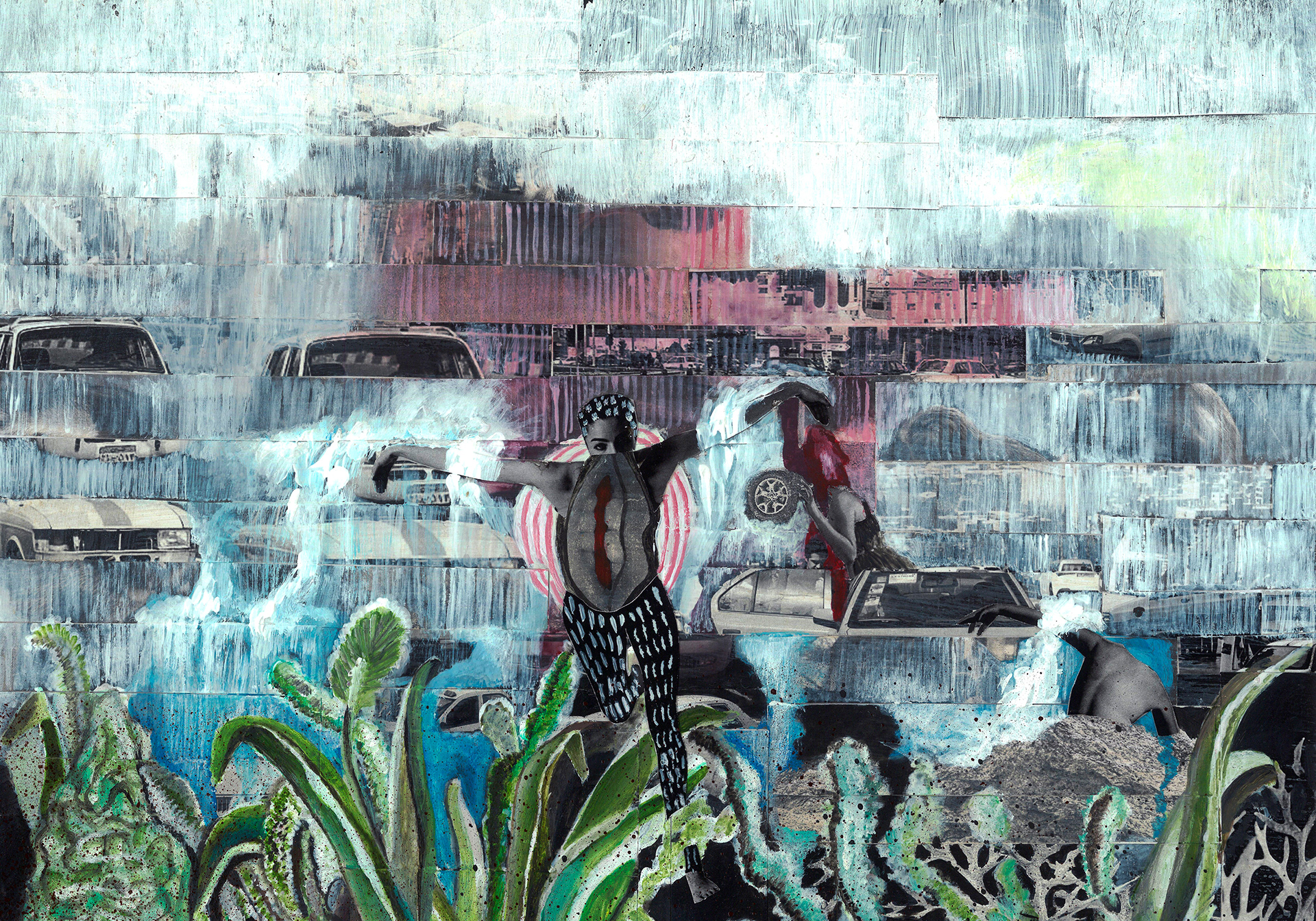 I comb her hair gently, wishing she would wake up/ Acrylic, collage, cardboard/ 2022